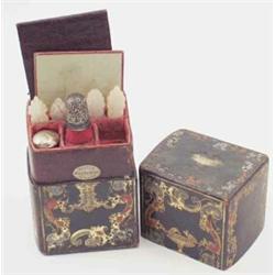 A Victorian tooled leather lady's companion, the case decorated with vases and scrolls containing sewing tools with mother-of-pearl handles, a thimble, aide memoires etc, makers paper label of Baxter, The Strand, 4.5 ins. £100-150
