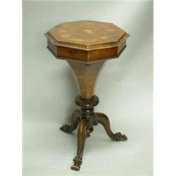 A Victorian walnut and floral marquetry octagonal top work table with fitted interior on cabriole leg tripod base 1ft 6ins £250-350