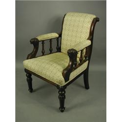 A Victorian walnut armchair, with an upholstered back, arms and seat, the arms with spindles a...