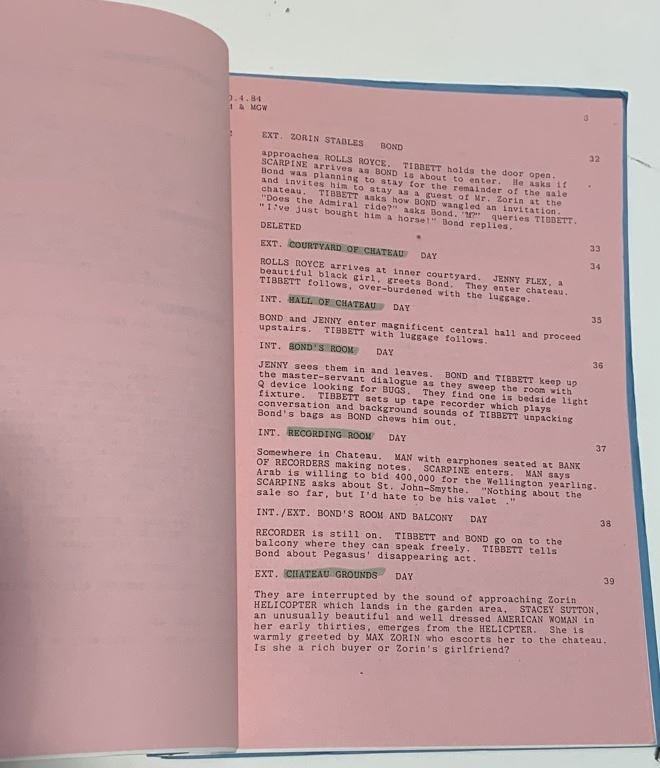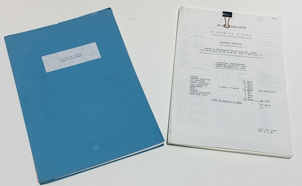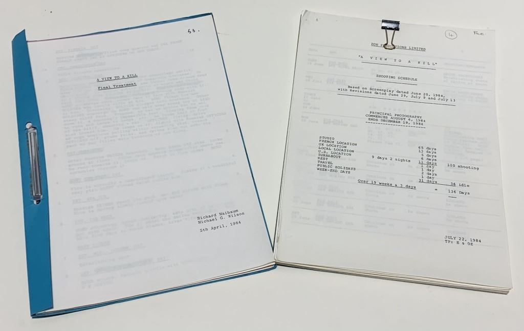 Original final treatment and shooting schedule used in the production of the John Glen directed spy film 'A View to a Kill' (1985), the seventh and the last to star Roger Moore as the fictional MI6 agent James Bond. In A View to a Kill, Bond is pitted against Max Zorin, who plans to destroy California's Silicon Valley.