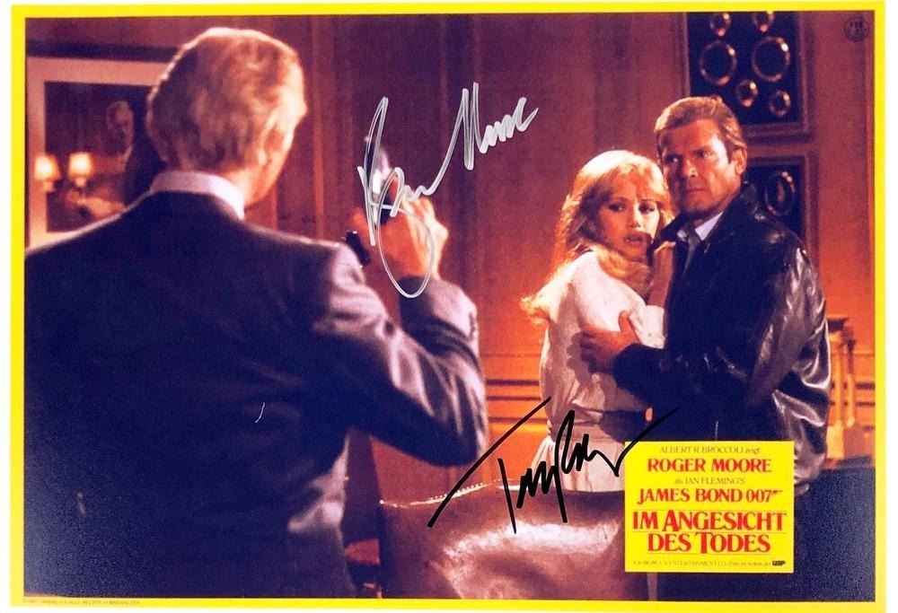 A View to a Kill Roger Moore and Tanya Roberts facsimile signed movie photo. 8x10 inches. This item is a reprint of an original autograph