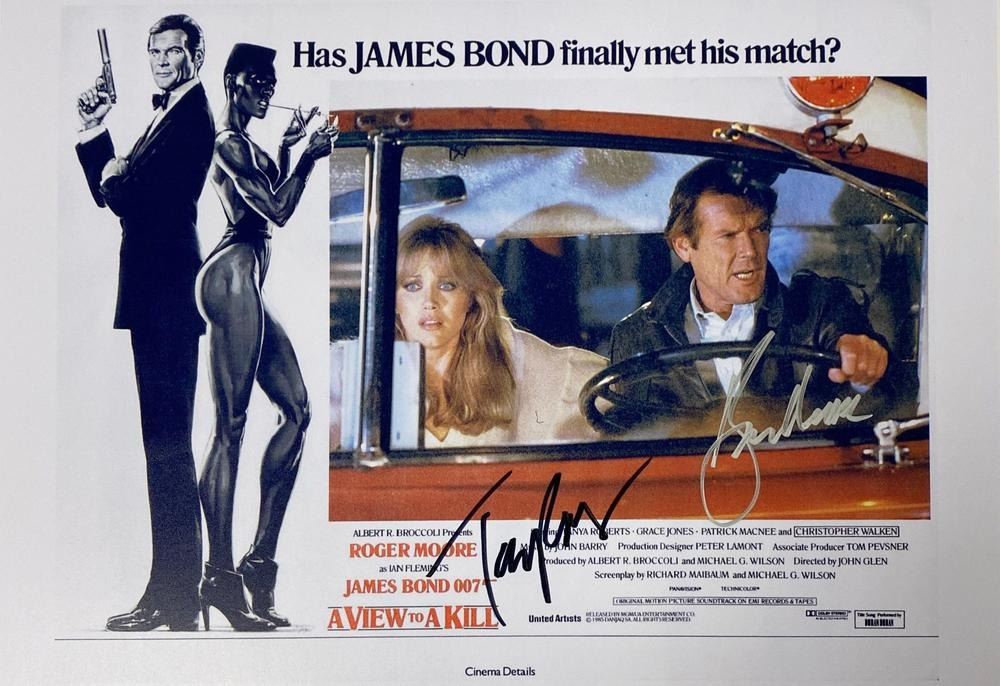 A View to a Kill Tanya Roberts and Roger Moore facsimile signed movie photo. 8x10 inches. This item is a reprint of an original autograph