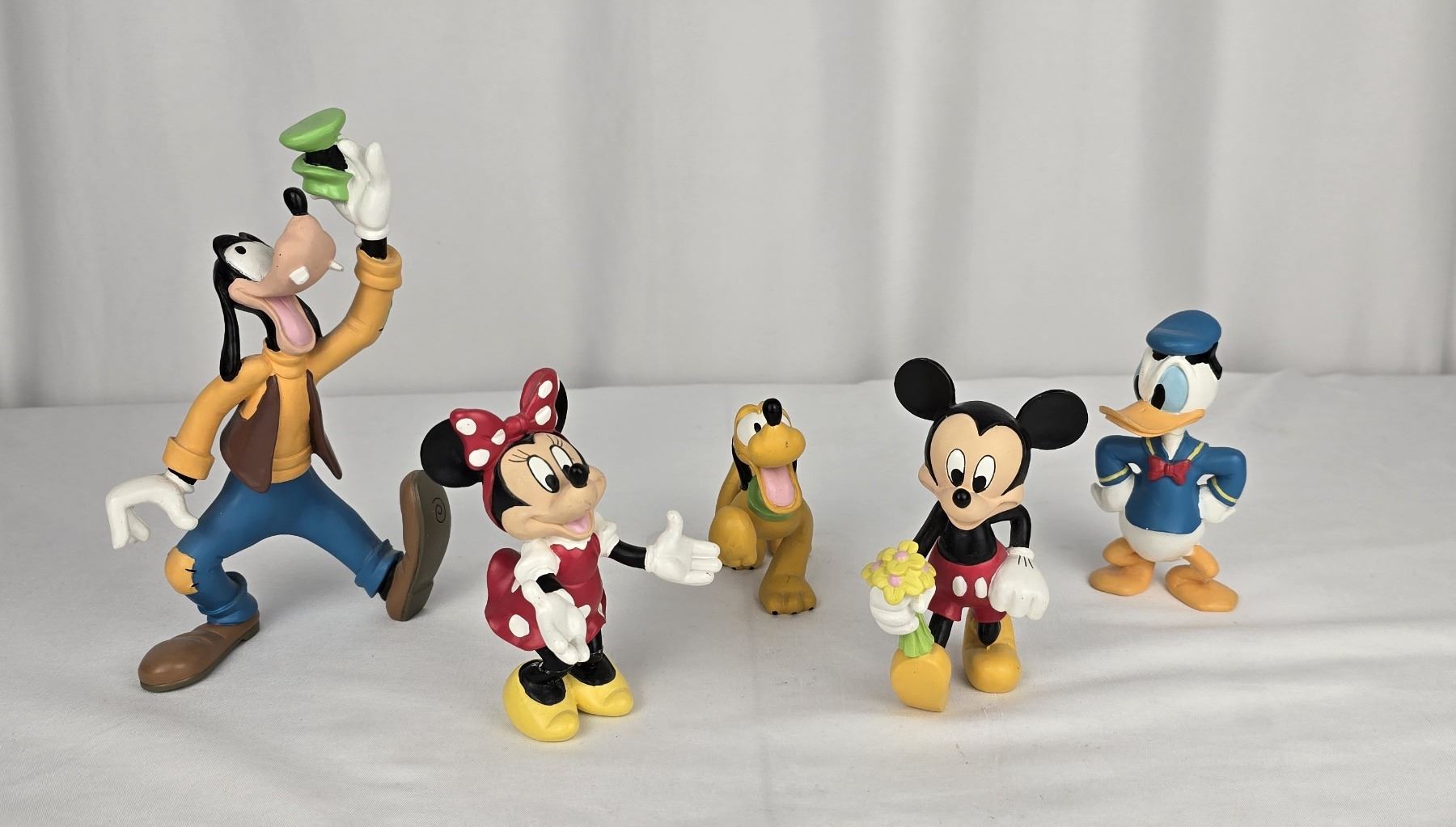 This is a set of five figures of the Fabulous Five (Mickey, Minnie, Pluto, Goofy and Donald.) Heights range from 3.75” to 7” tall. They are in good condition.