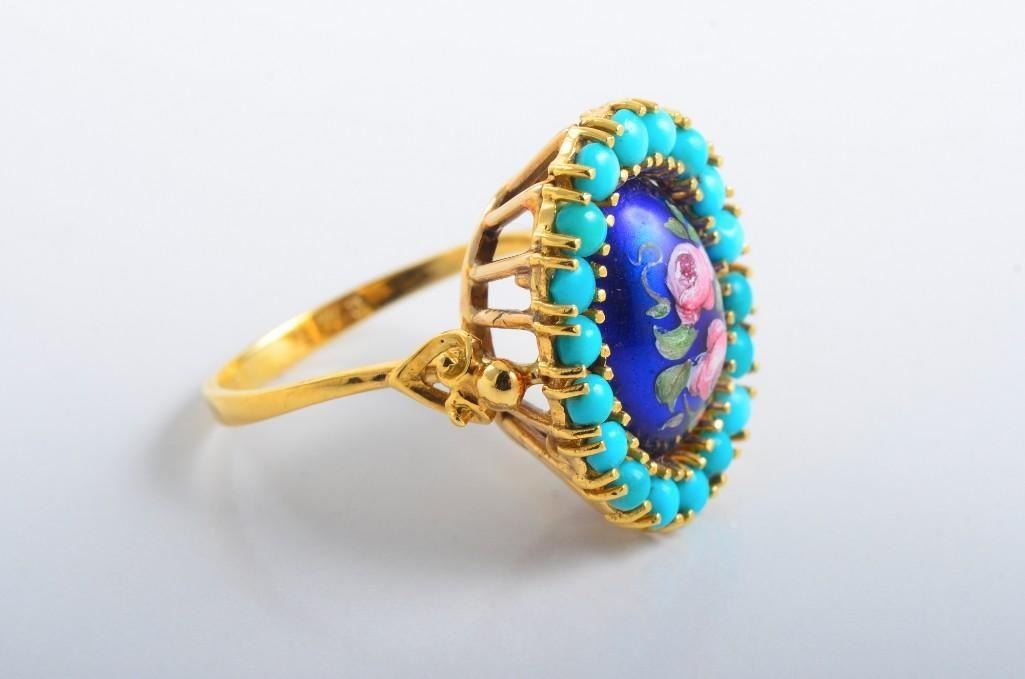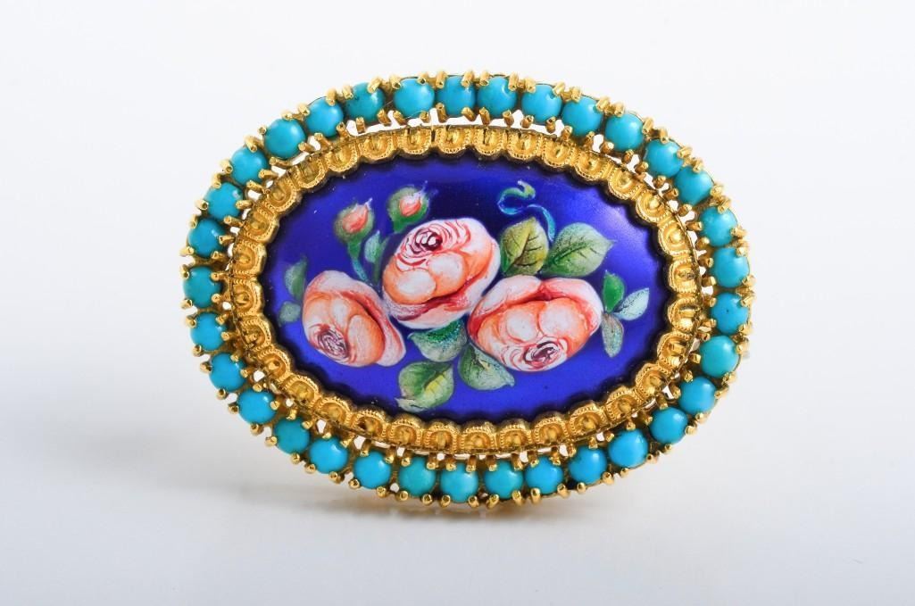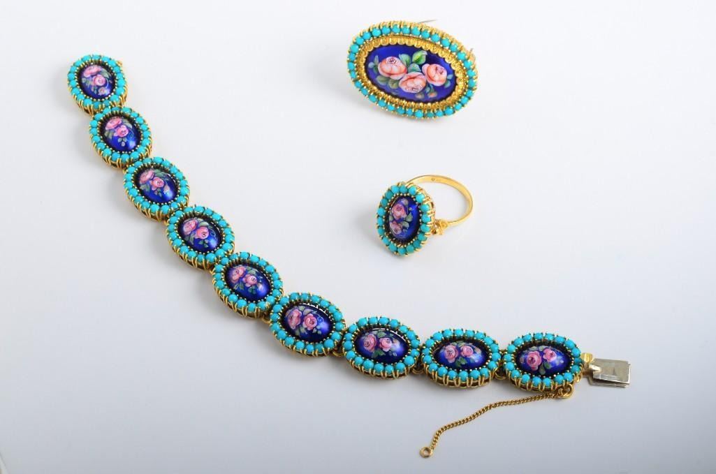 Featuring enamel paintings of pink roses against a deep blue background surrounded by turquoise cabochons; bracelet length approximately 7 inches; brooch height 1-3/8 inches; ring size 5-1/4.