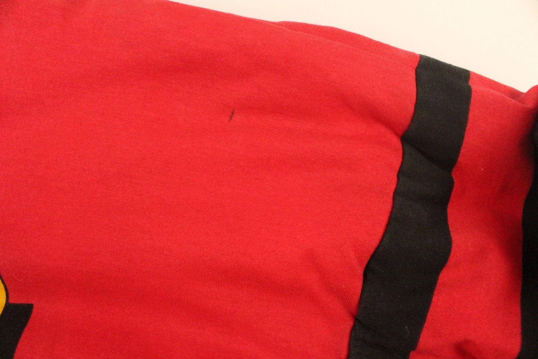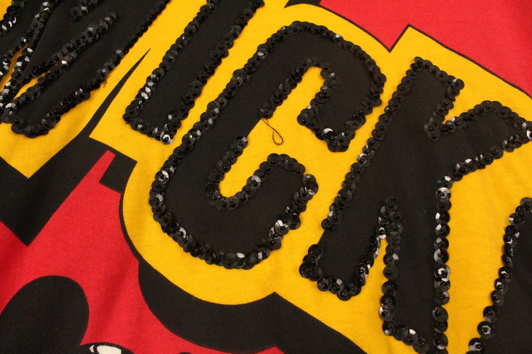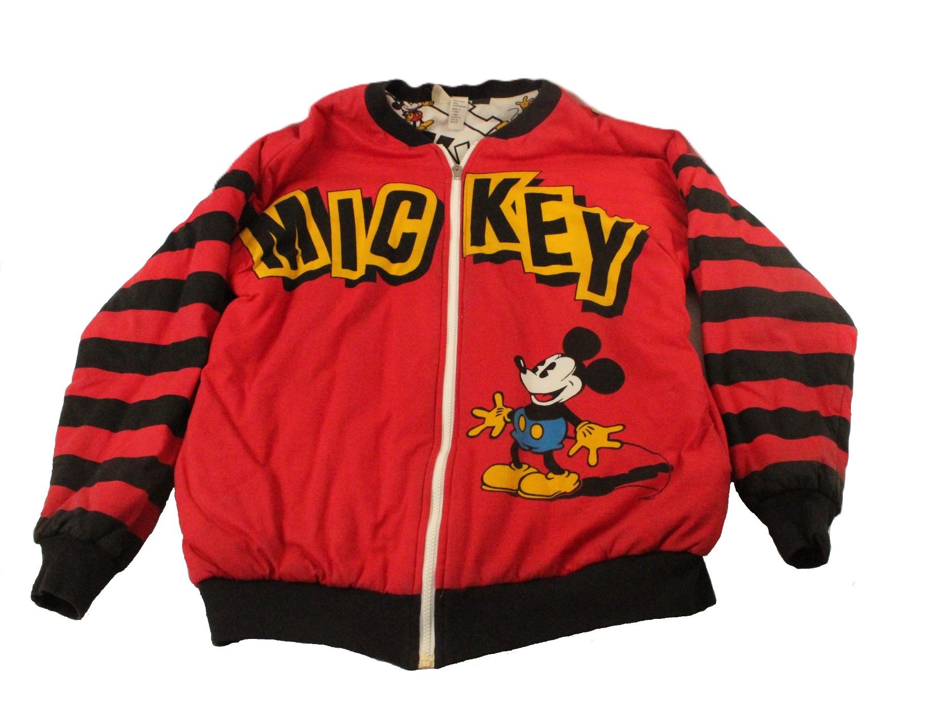 This is a red cotton jacket that features Mickey Mouse. The back has Mickey in giant letters surrounded by black sequins. It is most likely size medium with is in great condition with one small stain noted. The interior is a white print feature Mickey if medium sized letter with variations of the Mickey Mouse character.