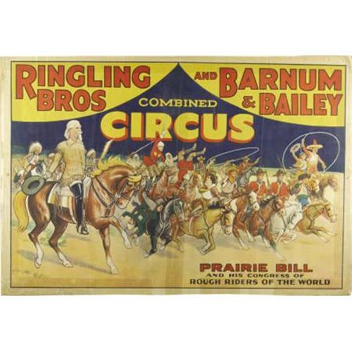 <B>A VINTAGE RINGLING BROTHERS AND BARNUM AND BAILEY "WILD WEST" CIRCUS POSTER- PRAIRIE BILL</B></I> - <BR><BR>28" x 41"<BR><BR>Prairie Bill and his Congress of Rough Riders was a star attraction in the world famous Ringling Brothers and Barnum and Bailey Circus shows. This vibrant yellow and blue poster is in fine condition and captures the stampede of Prairie Bill and his Rough Riders. These shows delighted onlookers as the Wild West came to life in front of them.<BR><BR><b>Shipping:</b> Flat Material, Large (<a target="_blank" href="http://www.heritageauctions.com/common/shipping.php">view shipping information</a>)