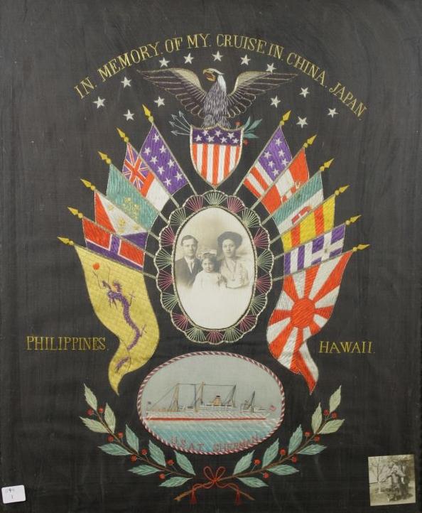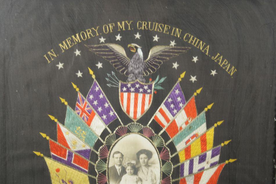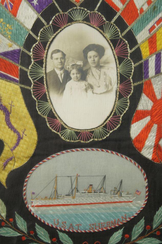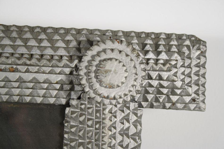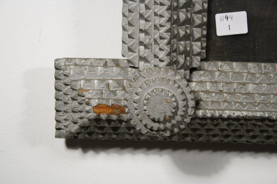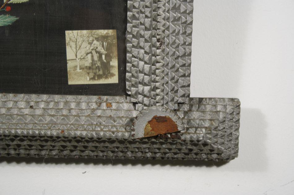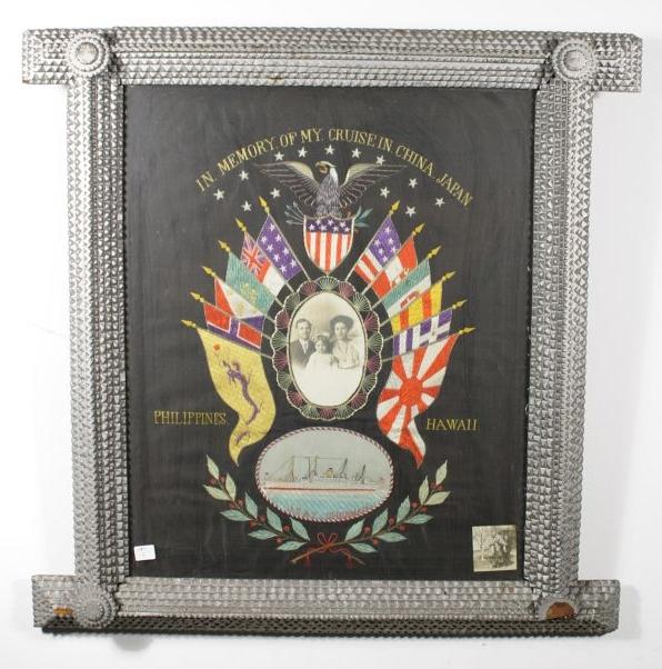A Vintage Tramp Art Wood Frame, Depicting a Souvenir Needlework with Photograph.