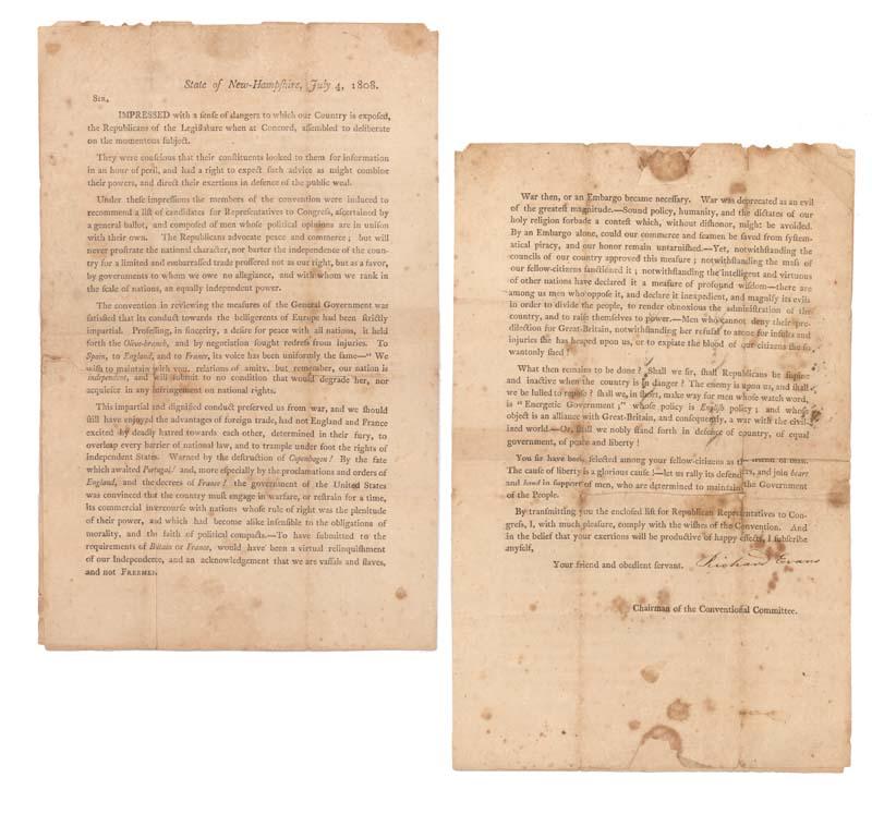 Printed Document Signed, “Richard Evans.” Two pages, 6” x 11”. State of New Hampshire. July 4, 1808. Addressed on integral leaf to “John Smith Esq. Seabrook” The document reads, in part: “ IMPRESSED with the sense of dangers to which our Country is exposed, the Republicans of the Legislature when at Concord, assembled to deliberate on the momentous subject. They were conscious that their constituents looked to them for information in an hour of peril, and had a right to expect such advice as might combine their powers, and direct their exertions in defense of the public weal … The Republicans advocate peace and commerce; but will never prostrate the national character, nor barter the independence of the country for a limited and embarrassed trade proffered not as our right, but as a favor, by governments to whom we owe no allegiance, and with whom we rank in the scale of nations, an equally independent power. The convention in reviewing the measures of the General Government was satisfied that its conduct towards the belligerents of Europe had been strictly impartial …. To Spain, to England, and to France, its voice has been uniformly the same - “We wish to maintain with you, relations of amity, but remember, our nation is independent, and will submit to no condition that would degrade her, nor acquiesce to any infringement on national rights … To have submitted to the requirements of Britain or France, would have been a virtual relinquishment of our Independence, and an acknowledgement that we are vassals and slaves and not FREEMAN …Shall we sir, shall Republicans be supine and inactive when the country is in danger? The enemy is upon us, and shall we be lulled to repose? Shall we, in short, make way for men whose watch word is ‘Energetic Government:’ whose policy is English policy? … The cause of liberty is a glorious cause! - Let us rally its defenders, and join heart and hand in support of men, who are determined to maintain the Government of the People … “Toning. Reinforced folds. Splits at intersections of vertical and horizontal folds. Paper loss from wax seal at bottom and top of second page, not affecting text. Overall Good.