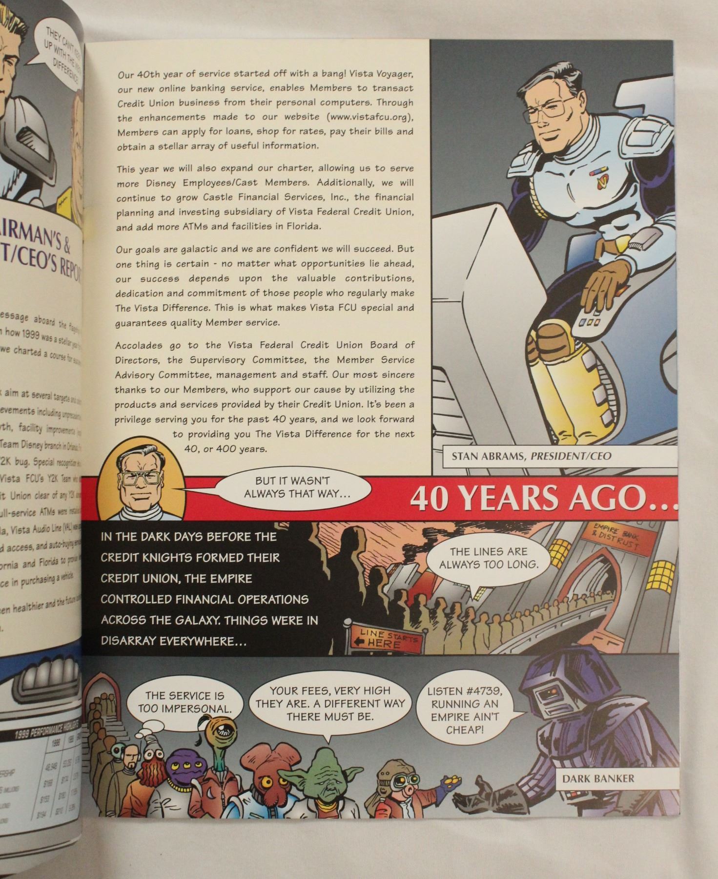 Vista Credit union was the original credit union at the Disney Studio. It exoanded to Walt Disney World in 1970 and merged with Partners Credit Union in 2007 to serve all Disney Company Cast Members. This comic was issued as a creative way to celebrate the company's 40th anniversary. It is in near mint condition and includes a letter to the member from the President and CEO Stan Abrams.