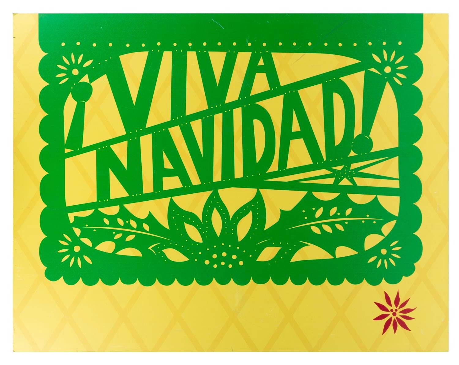 (Disney Parks, 2010s) A Viva Navidad! sign from Disney California Adventure or Walt Disney World. The festive sign sports a hidden Mickey in the poinsettia decoration at bottom right. Measuring 20.5" x 26.25", the acrylic sign displays in very good condition with small scuffs and scratches from Park display.