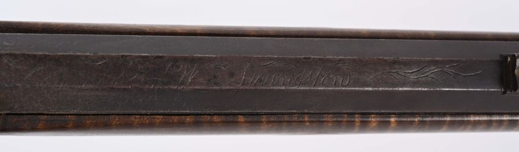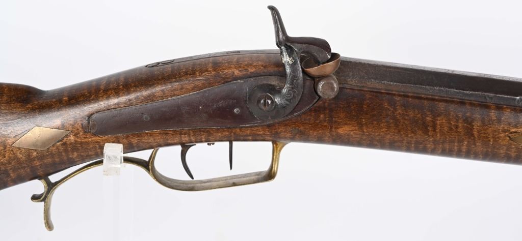 There is an AW from Stuart Iowa and a Andrew W. from San Francisco. Both rifle makers. Features a 36" octagon barrel in 36 caliber. Has percussion unmarked back action lock, double set triggers, brass furniture including 4-piece patch boxpewter fore-end tip, knife blade front sight, striped maple half stock, single leaf rlear sight Condition. Brass and stock are excelletn but have been cleaned. Barrel is brown patina. newer wood rod, triggers not working. Bore is excellent. ANTIQUE