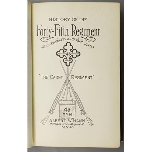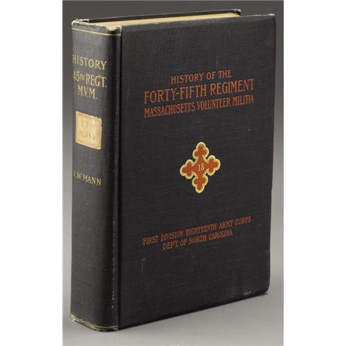 <B>A. W. Mann: <I>History of the Forty-Fifth Regiment Massachusetts Volunteer Militia</B></I>.</B></I> (Jamaica Plain, Massachusetts: Brookside Print, 1908), first edition, 562 pages, black cloth with orange and gilt lettering on the spine and front board, 8vo (6.25” x 9.25”), no dust jacket. This ex-library edition is good, with sunning to the spine, a library sticker on the front pastedown, a library due date card and card holder affixed to the rear endpapers, and corner, edge, and spine wear. Front hinge starting. There is a small chip at the tail of the spine as well as a previous owner's signature on the front free endpaper. The textblock is bright and clean on this handsome Civil War militia history.<BR><BR><b>Shipping:</b> Books & Catalogs (<a target="_blank" href="http://www.heritageauctions.com/common/shipping.php">view shipping information</a>)