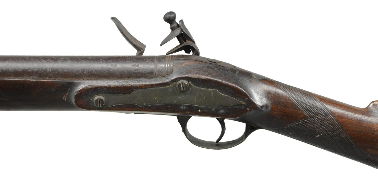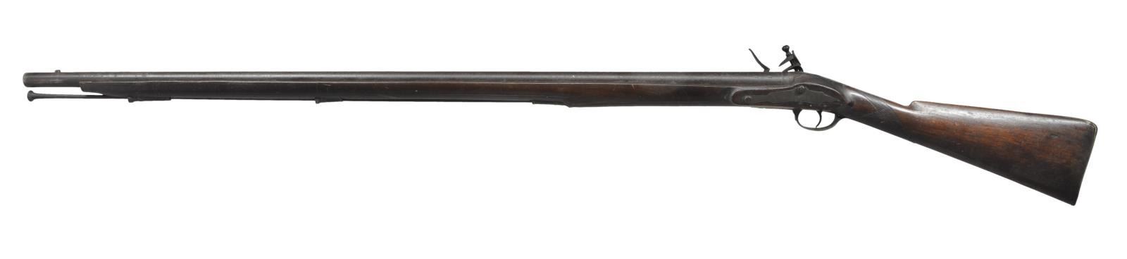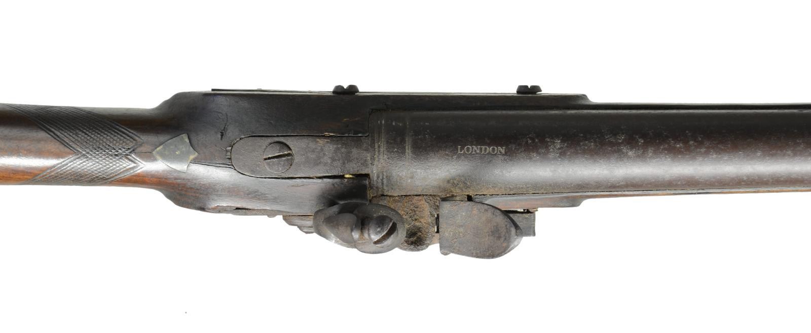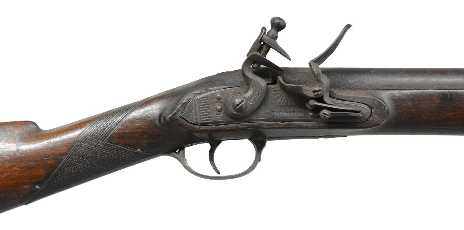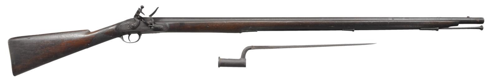 Cal. 70. NSN.56" overall, 40" round barrel, British proofed, "LONDON" stamped, pinned with 3 brass ramrod pipes, iron trumpet tip ramrod, bayonet lug on top. Brass buttplate, triggerguard, and sideplate. Rebated engraved lockplate, serpentine cock, roller frizzen stamped "A. W. SPIES / WARRANTED" Spies was large New York gun dealer and this dates circa 1820. Stock is checkered at wrist with small silver vacant diamond shaped thumb plate. CONDITION: Very good overall, appears as found, complete and original, iron and brass patina, mechanics fine with smooth clear bore. Accompanying Brown Bess style bayonet has 14.5" blade, fits well with matching patina. (01-22952/JS). ANTIQUE. $600-800.