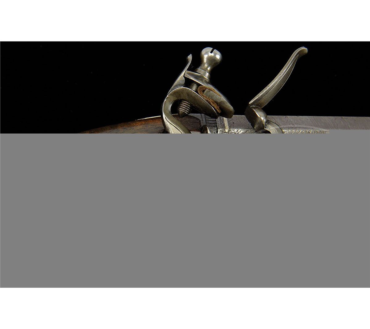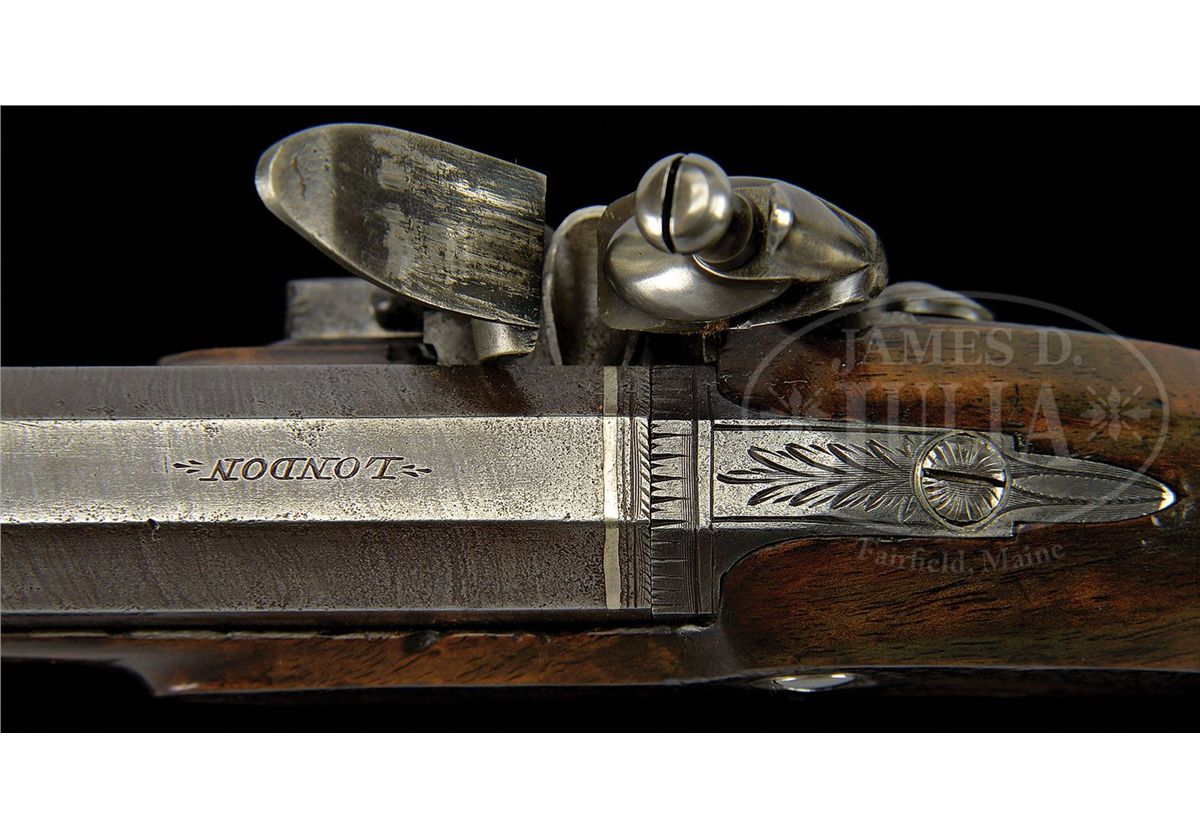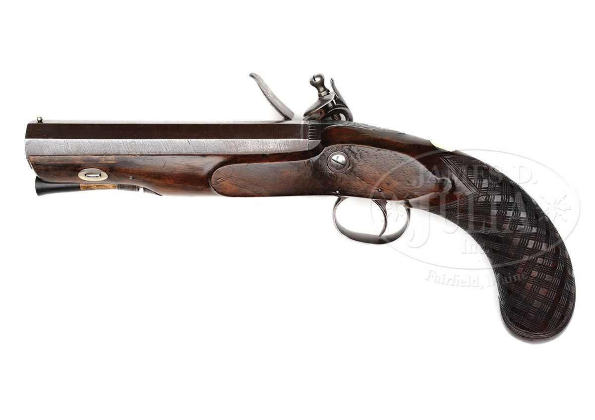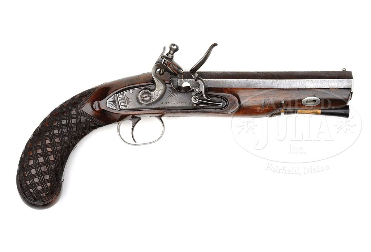 NSN. Cal. .655 Bore diameter. 6" Octagon twist bbl is marked "London" on top. Lock with rebated tail, semi-waterproof bridled pan, and roller frizzen, has serpentine cock, and is engraved "A. W. Spies" (listed as a retailer, New York, NY 1934-1857) under pan. Nicely shaped stock with skip line checkered bag grip is iron mounted. There is a vacant silver oval at top of grip. Stock attaches to bbl with side nail through oval silver escutcheons. Hickory ramrod has flared horn tip and mounts through two iron pipes. CONDITION: Good. Bbl retains traces of an old brown. Lock is cleaned to dark gray. Stocks retain most of an old oil refinish with some repairs to top edge toward muzzle. Lock and frizzen are crisp. 4-49610 MGM216