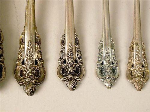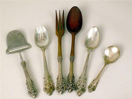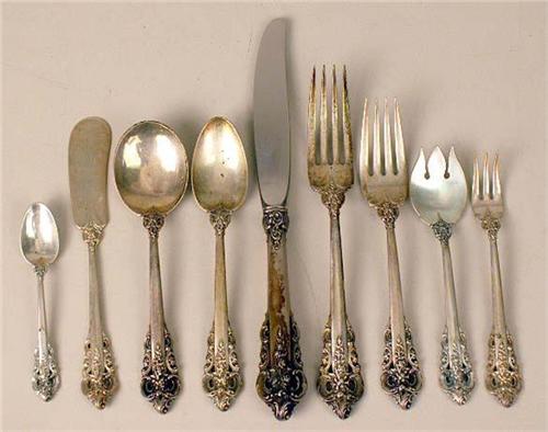 Comprising twelve dinner knives and forks, eleven cream soup spoons, nine salad forks, sixteen teaspoons, twelve flat handled butter spreaders, four seafood forks, two ice cream forks, two tablespoons, a sugar shell, a condiment fork, a master butter spre