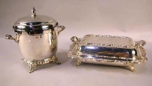 A WALLACE SILVER PLATED DOUBLE HANDLED COVERED AND FOOTED ICE BUCKET, "BAROQUE STYLE"; 10"h Together with a covered double handled chafing dish 14"l