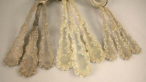 A WALLACE STERLING SILVER PARTIAL FLATWARE SERVICE; Monog., comprising: 5 tablespoons, 11 place spoons, 8 teaspoons, 7 dinner forks, 11 luncheon forks and 1 seafood fork, apx. 57 T.O.