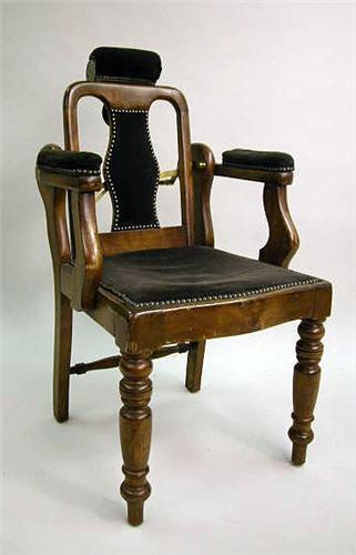 A WALNUT BARBER CHAIR; With adjustable back and headrest, some wear 40"h