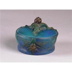Lot 614 A. WALTER COVERED BOX Diminutive blue circular box decorated with pinecone motif on box and lid. Signed “A. Walter Nancy” and artist signed on lid.  SIZE: 2-1/2” t. x 2-3/4” w.  CONDITION: Bubble in making on lid’s edge, otherwise very good to excellent.  5-70613