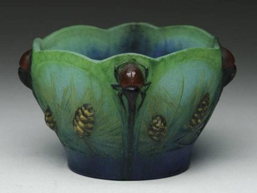 A. WALTER NANCY PATE DE VERRE BOWL. Outstanding Pate de Verre bowl features three-dimensional locust and pinecones in colors of brown, green and blue. Signed on the side of the foot "A. Walter Nancy". SIZE: 3-1/2" t. CONDITION: Very good to excellent. 5-62039