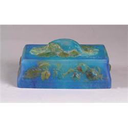 Lot 615 A. WALTER PATE DE VERRE COVERED BOX Fabulous covered box with blue mottled background complimented by berry and floral motif in yellows, greens, and reds. Signed “A. Walter Nancy France” also artist signed “H. Berge SC”. SIZE: 5-3/4” l x 3-1/2”w x 2-1/2” t. CONDITION: Very good to excellent. 5-70612