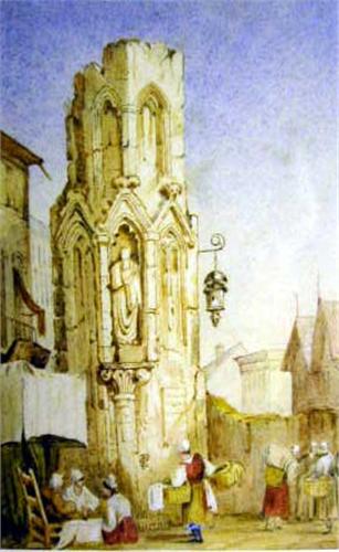 A WATERCOLOR OF CHURCH TOWER IN MARKET; Initialed, 7"h x 4"w