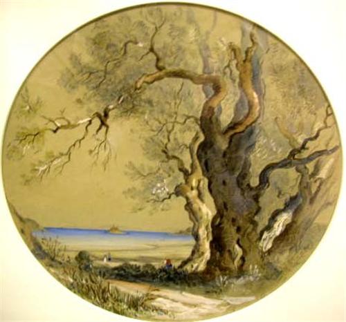 A WATERCOLOR OF TREES ALONG A HARBOR; Signed illegibly, lr, within a circular mat, framed, 11"dia.