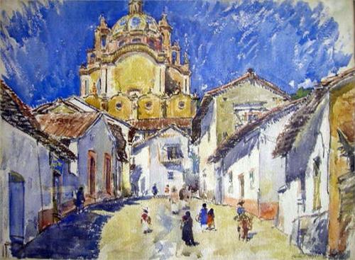 A WATERCOLOR ON PAPER; depicting a street scene anchored by a cathedral, signed l.r. Herbert Meyer (American, 1882 - 1960) Mexico 1937. Verso with a label from the Raydon Gallery, 1091 Madison Avenue, New York, and another with typewritten artist informat