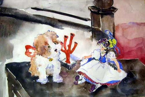 A WATERCOLOR ON PAPER; Toys, Vera White (American, 1881 - 1966), verso with an old label noting the title, and another marked with the price (reduced from $125 to $100). Foxing and staining to mat; watercolor in good condition. 14 1/4" x 21"