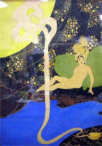 A WATERCOLOR ON PAPER; depicting an Oriental princess against a lush exotic backdrop, signed l.l. Ernst Jung '22 (Danish, dates unknown). 19 3/4" x 14 1/2"