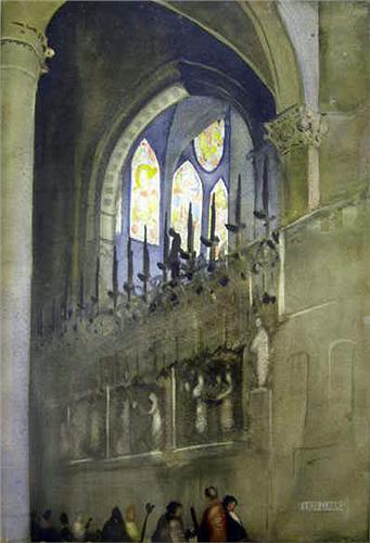 A WATERCOLOR ON PAPER; Chartes Cathedral, Interior, Eliot O'Hara (American, 1890-1969), signed l.r. Verso with several old labels; two from the Raydon Gallery, 1091 Madison Avenue, New York, one from the 1976 Weatherspoon Annual Art on Paper Exhibiton, Un