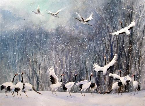 A WATERCOLOR ON PAPER OF SNOW BIRDS; Signed lr YU SHAN, 30" x 22"