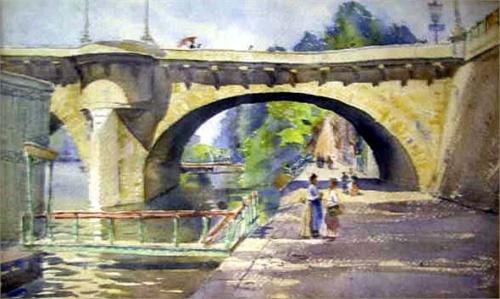 A WATERCOLOR ON PAPER; possibly depicting Notre Dame cathedral, unsigned. Together with a watercolor on paper, Along the Seine, Paris. Verso having an old label from the Raydon Gallery, 1091 Madison Avenue, New York, which notes the artist as Florence Rob