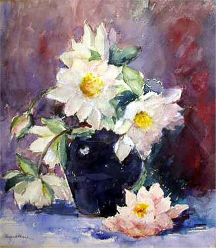 A WATERCOLOR ON PAPER; depicting magnolia blossoms in a vase, signed l.l. Susan B. Chase. Together with two photorealistic images, one of a Severin Roesen still-life on masonite, the second on paper backed with canvas of a still life with fruits. 3 pieces