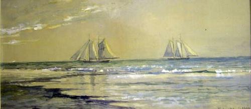 A WATERCOLOR ON PAPER; depicting clipper ships on the horizon, signed illegibly l.r. and dated 1896. Together with a second watercolor of clipper ships. 2 pieces. The first 20" x 9"