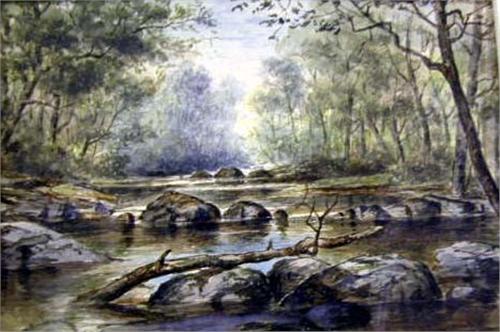 A WATERCOLOR ON PAPER; Depicting a country stream scene 5 1/2"h x 4"w (losses)