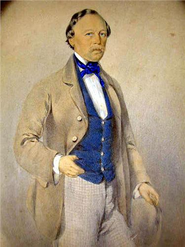 A WATERCOLOR PORTRAIT OF A STANDING GENTLEMAN; Wearing a jacket and blue vest