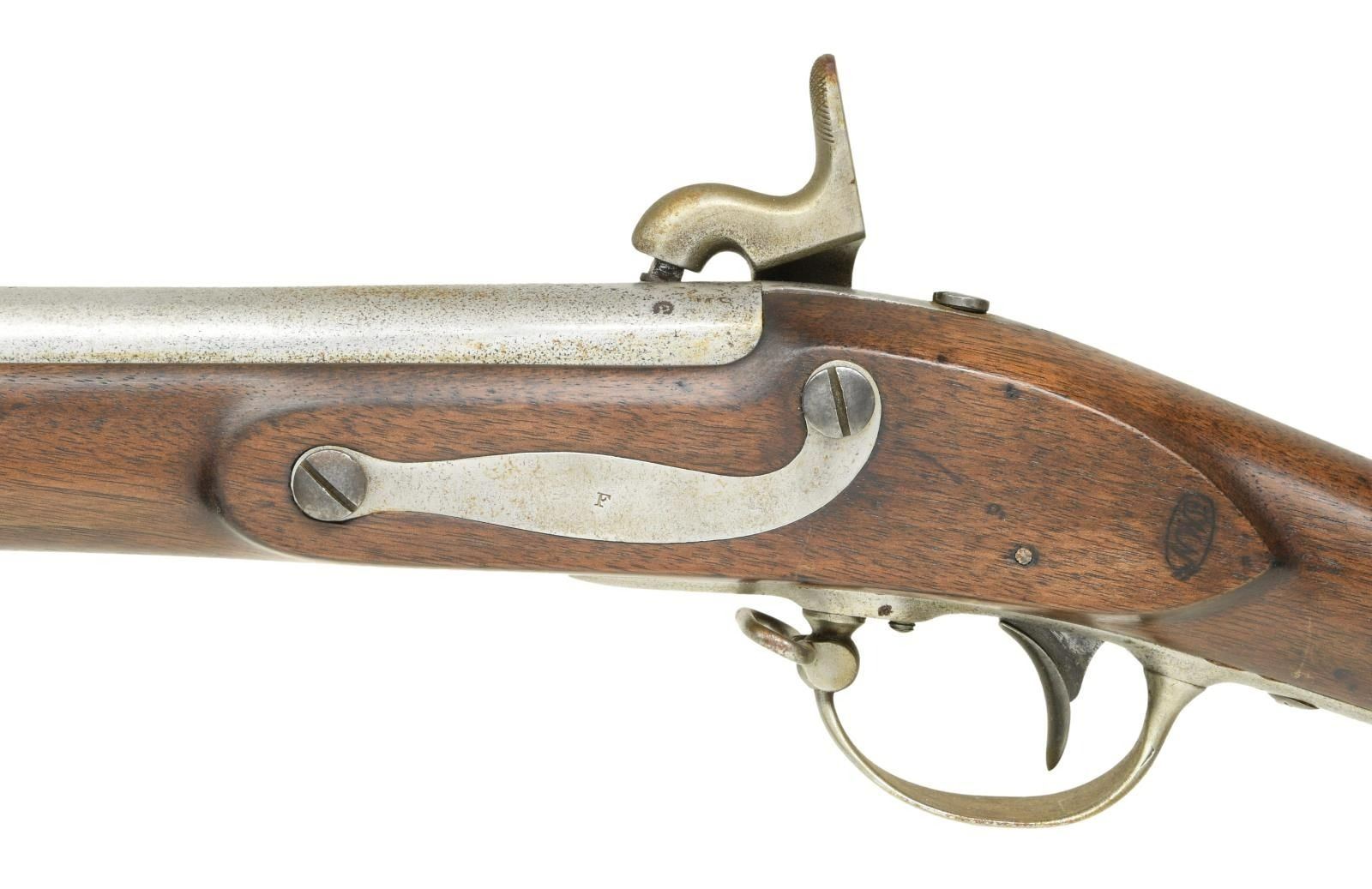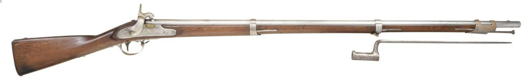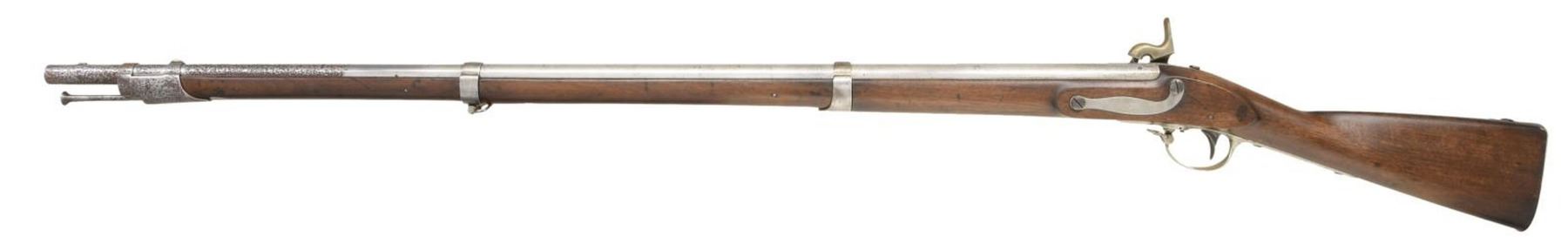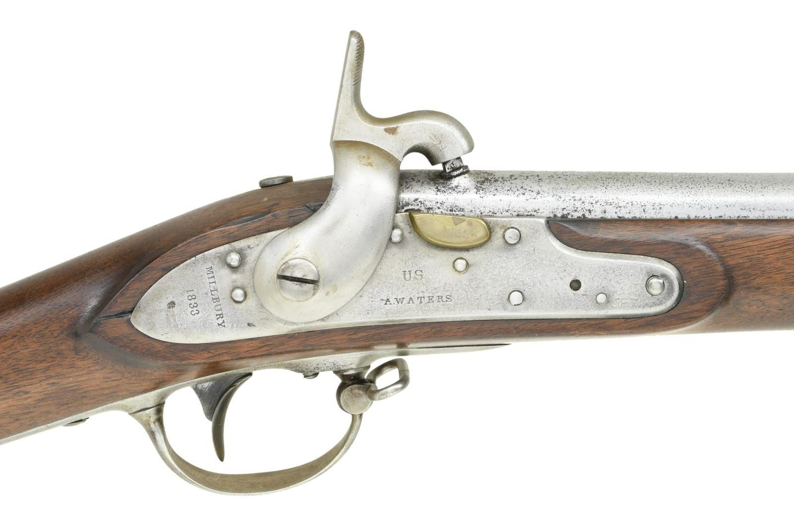 Cal. 69. NSN. Bbl. 42". US 1816 musket updated to percussion. Rear of lock marked "MILLBURY 1833". Center of lock marked "US A. WATERS". Rear of bbl. has faint circled "P" & "MS" markings for Massachusetts. No visible upper tang markings. Tang of buttplate marked "US". Walnut stock w/ three bands & bottom mounted sling swivels. Faint inspector's cartouche visible on left stock flat. Button head iron ramrod present. UNATTACHED ACCESSORIES: US marked 1816 socket bayonet w/ 16" blade. Bayonet is a dull gray patina w/ scattered oxidation & some dings. CONDITION: sanded stock has added oil finish w/ some chipping in ramrod channel, a few dings & scattered handling wear. Balance of metal was cleaned to silver w/ some pitting, dings & scattered oxidation. Oxidized bore. (01-24200/MJC). ANTIQUE. $500-900.