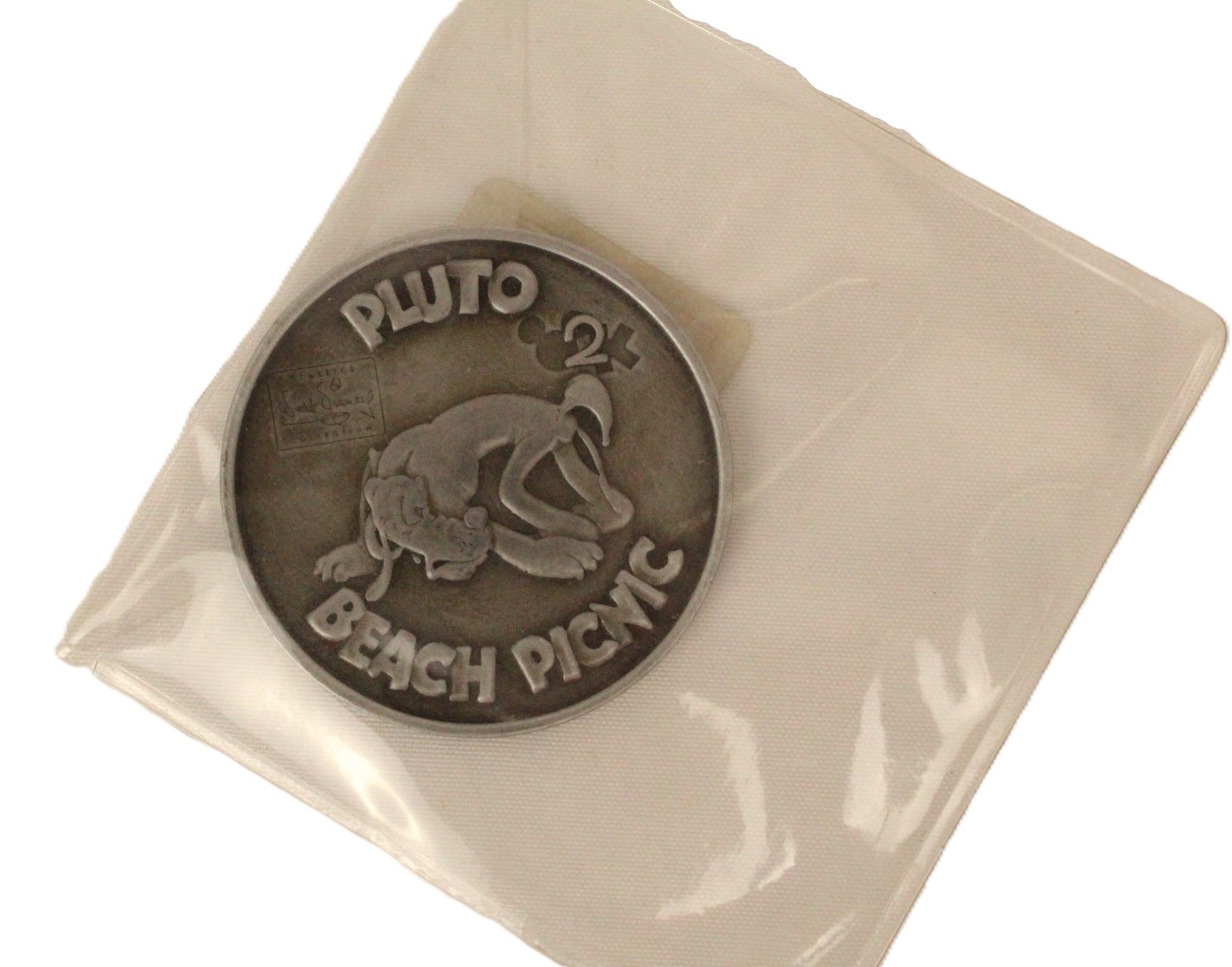 (WDCC, 2000) This is a WDCC pewter coin from the year 2000. One side shows Millennium Mickey On Top Of The World. The other Side has Pluto from Beach Picnic. The coin is sealed in package.