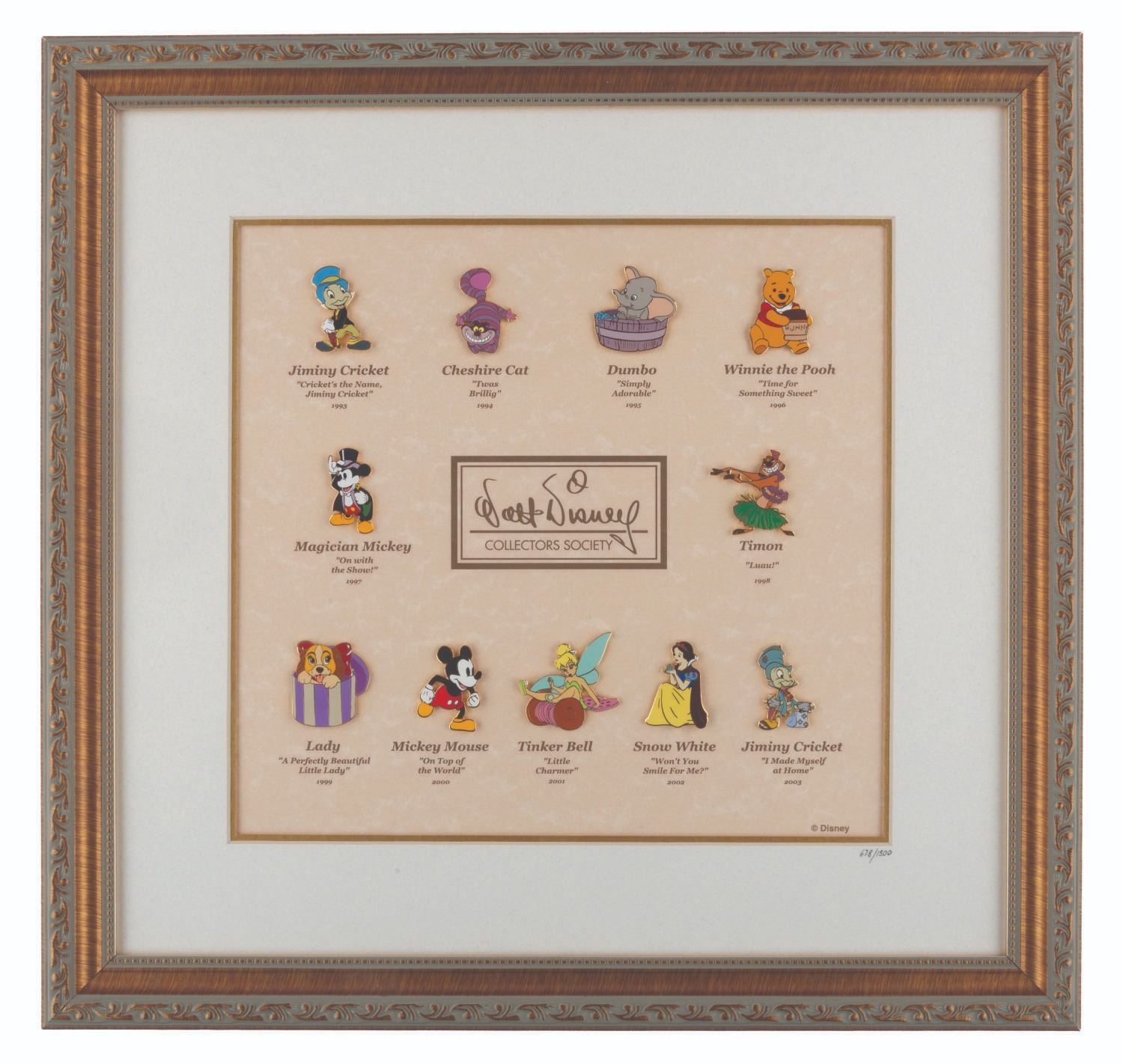 (WDCC, 2002) An 11-pin set celebrating the Walt Disney Collectors Society “Decade of Dreams.” Numbered 678 of 1500, the set includes Jiminy Cricket, Cheshire Cat, Dumbo, Winnie the Pooh, Magician Mickey, Timon, Lady, Mickey Mouse, Tinker Bell, and Snow White. Measuring 17” x 17.5” in its frame, the set is in fine condition.