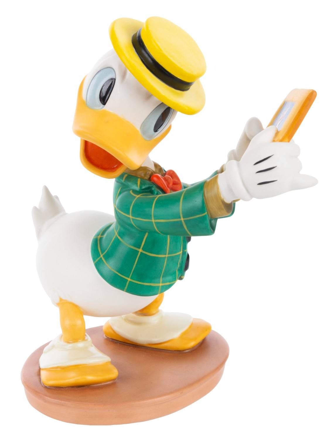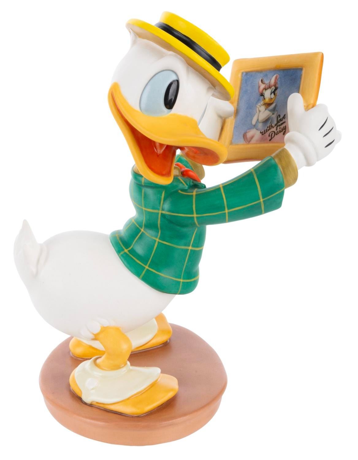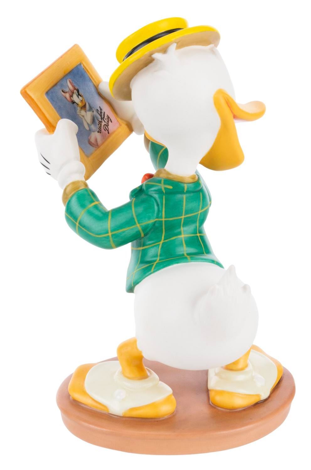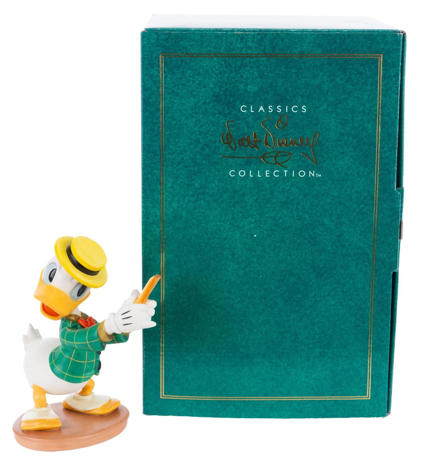 (WDCC, 1994) A Walt Disney Classics Collection “With Love From Daisy” figurine of Donald Duck inspired by the 1940 short “Mr. Duck Steps Out.” The figurine was sculpted by Kent Melton. Measuring 4.5” x 4” x 6.25” tall, the figurine is in fine condition, with the original box and COA.