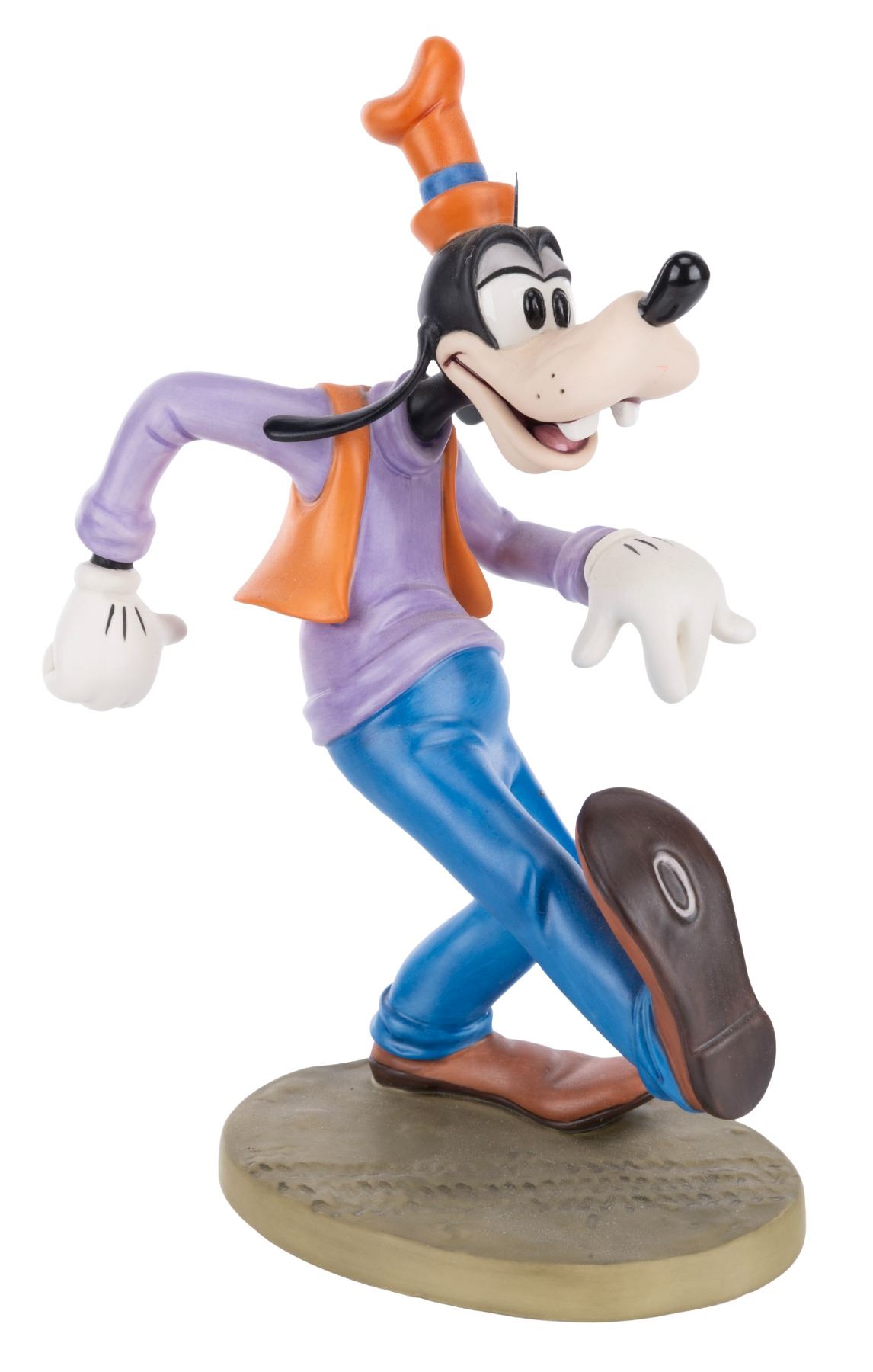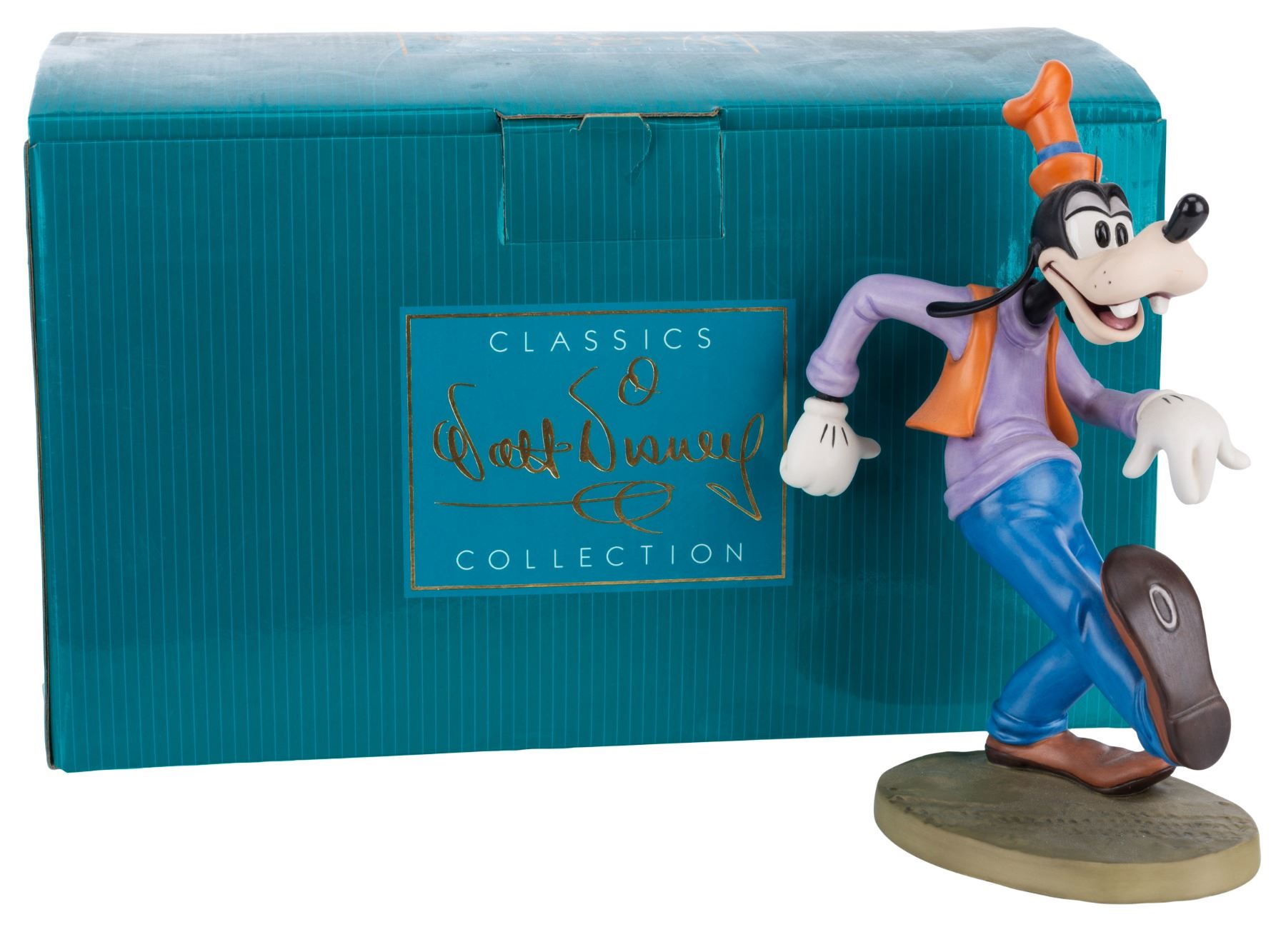 (WDCC, 1997) A Walt Disney Classics Collection “Oh, the World Owes Me a Livin’” figurine of Goofy inspired by the 1936 animated short “Moving Day.” The figurine was sculpted by Bruce Lau and released as the 1997 Animator’s Choice piece. Measuring 6.25” x 4.5” x 8.5” tall with its original 9” x 13” x 7.5” tall box, the piece is in fine condition.