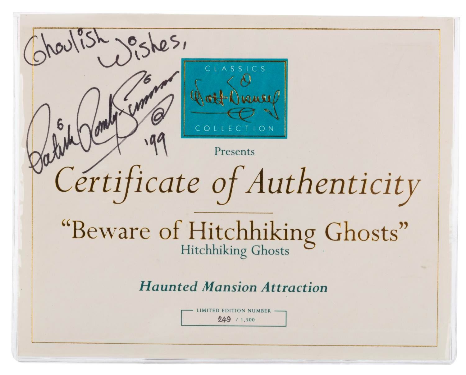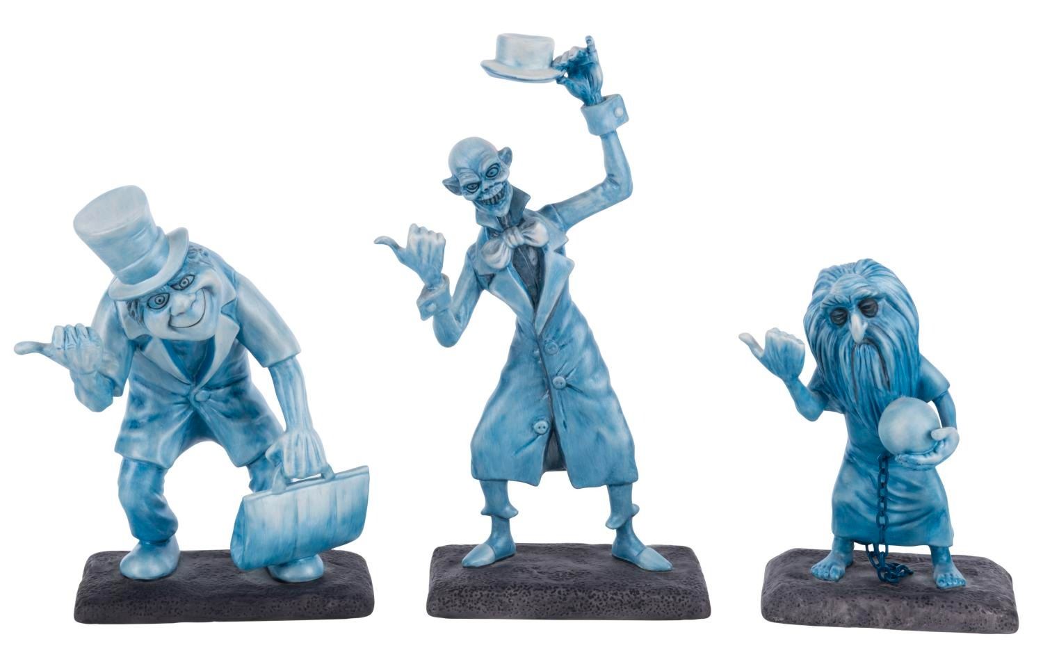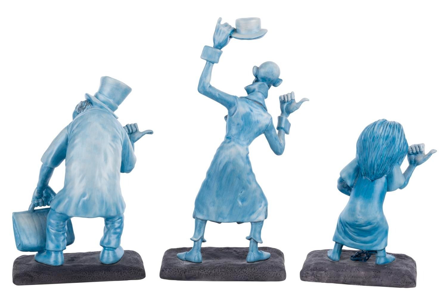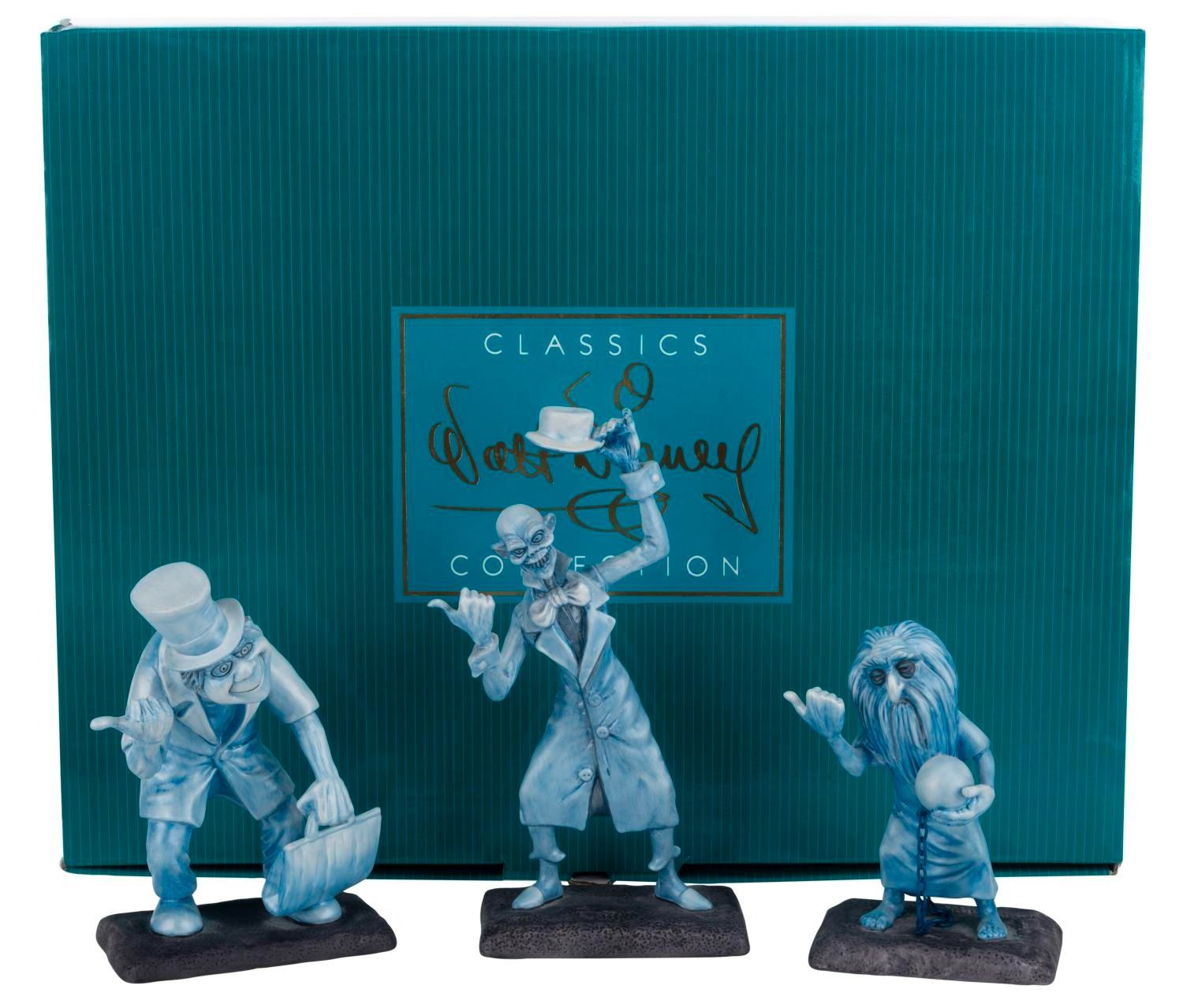 (WDCC/Disney Parks, 1999) A three-piece Walt Disney Classics Collection "Beware of Hitchhiking Ghosts" figure set released at the 1999 Disneyana Convention. Numbered 249/1500, the set features Phineas, Ezra, and Gus, the Hitchhiking Ghosts, and a Certificate of Authenticity signed by Patrick Romandy-Simmons. Measuring 5" to 8" tall with its 8.25" x 13.5" x 17" box, the figurines are in fine condition.