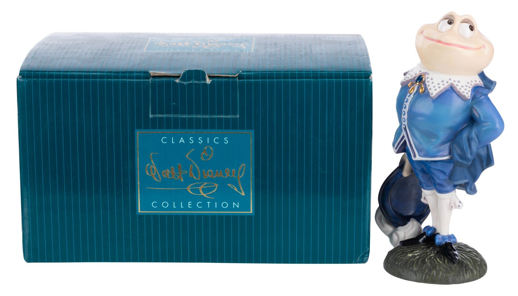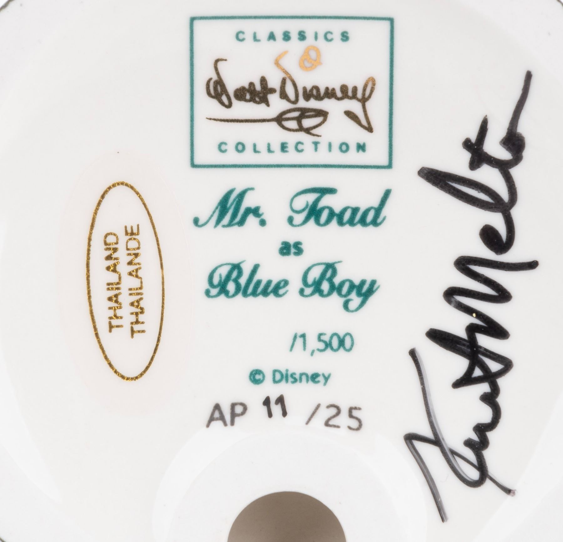 (WDCC, 2000) A Walt Disney Classics Collection Disneyland-exclusive “Mr. Toad as Blue Boy” figurine. This is the artist-proof version, numbered 11/25, and is signed on the bottom of the base in black marker by Kent Melton. Measuring 6.5” tall and 2.75” in diameter with its original 6” x 9” x 5” tall box, the porcelain figurine is in very good condition with light scuffs.