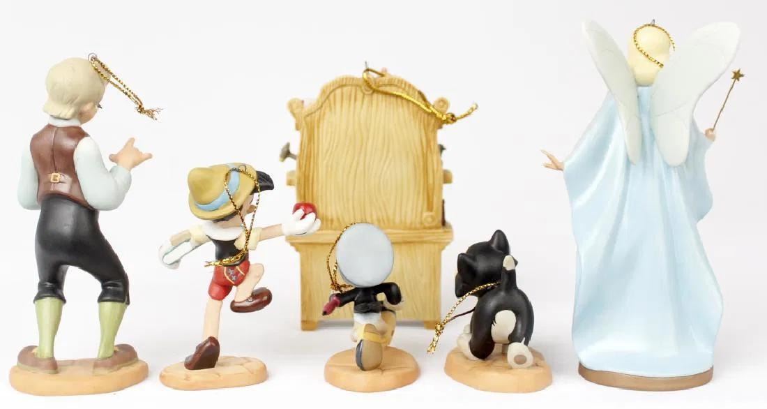 (WDCC, 2000) A Walt Disney Classics Collection limited edition “Pinocchio” ornament set featuring the Blue Fairy, Jiminy Cricket, Pinocchio, Geppetto, Figaro, and a toy shelf. Limited to 4000 sets, the ornaments are in fine condition with the original box.