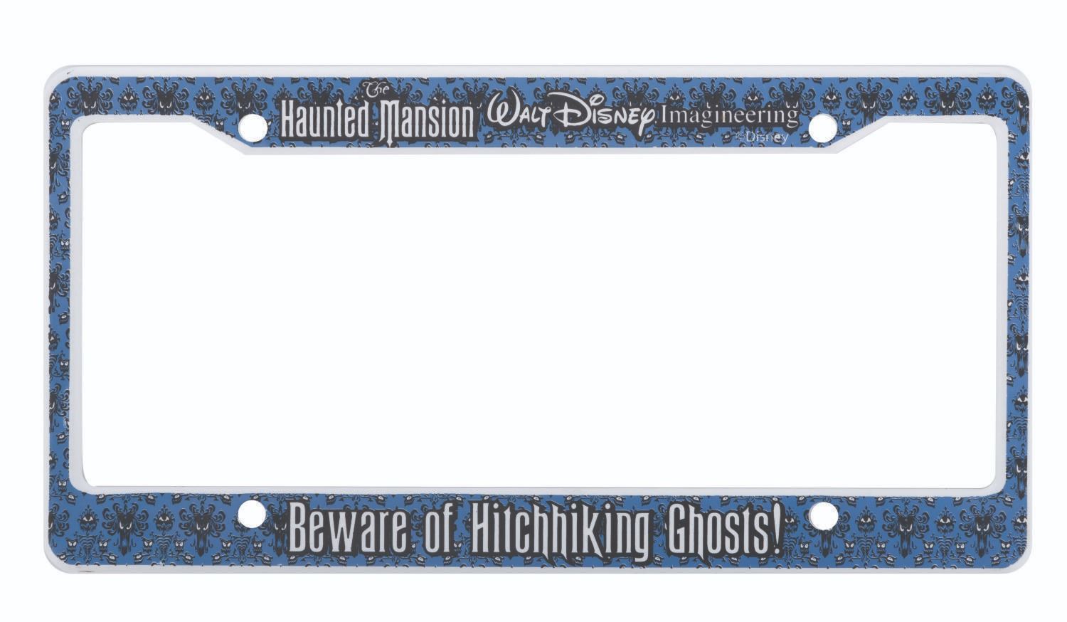 (Walt Disney Imagineering) A WDI “Beware of Hitchhiking Ghosts!” License Plate Frame.” This license plate frame was manufactured exclusively for Walt Disney Imagineering, featuring a screaming demon wallpaper motif. Measuring 12.25”x 6.25, the frame is in fine condition.