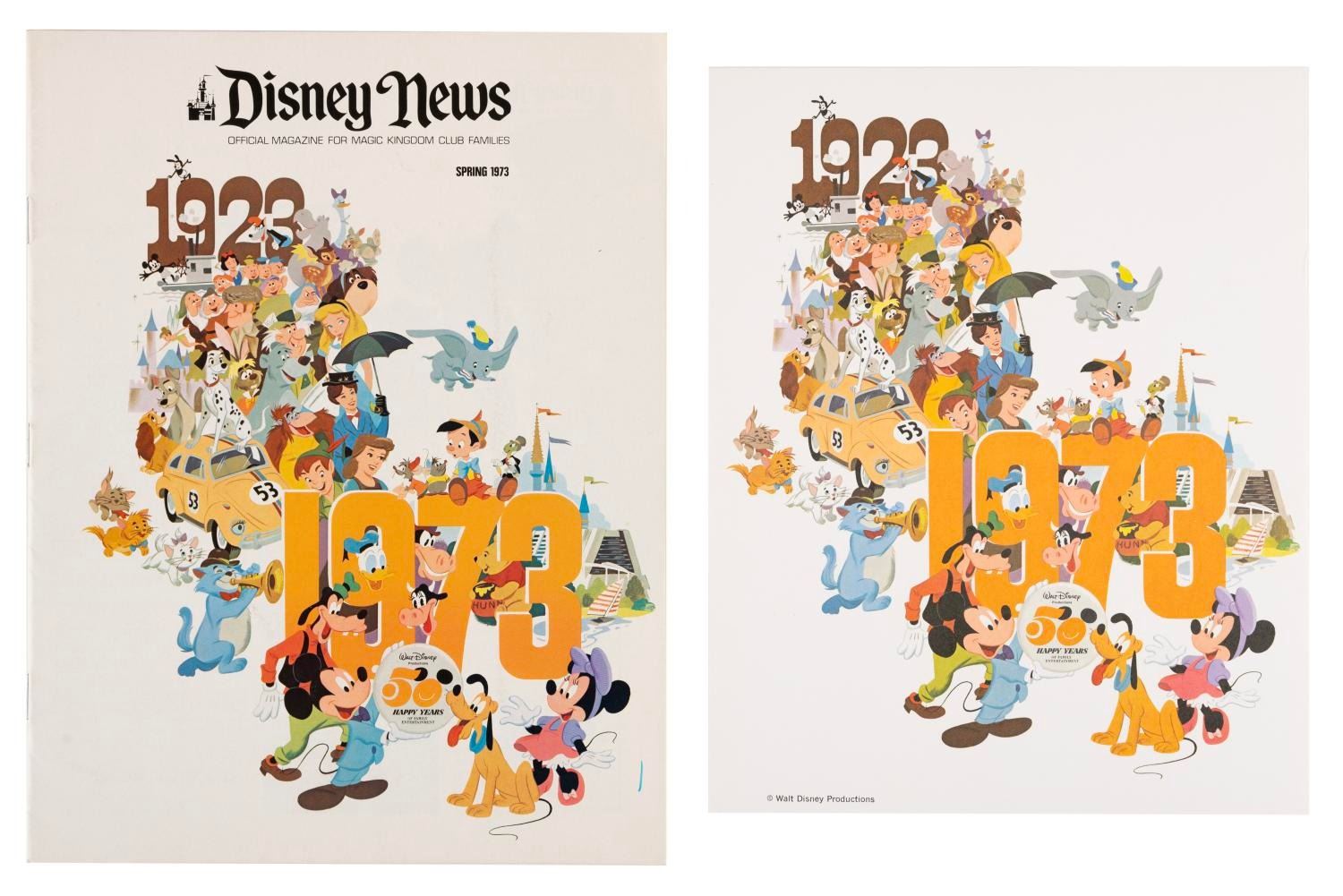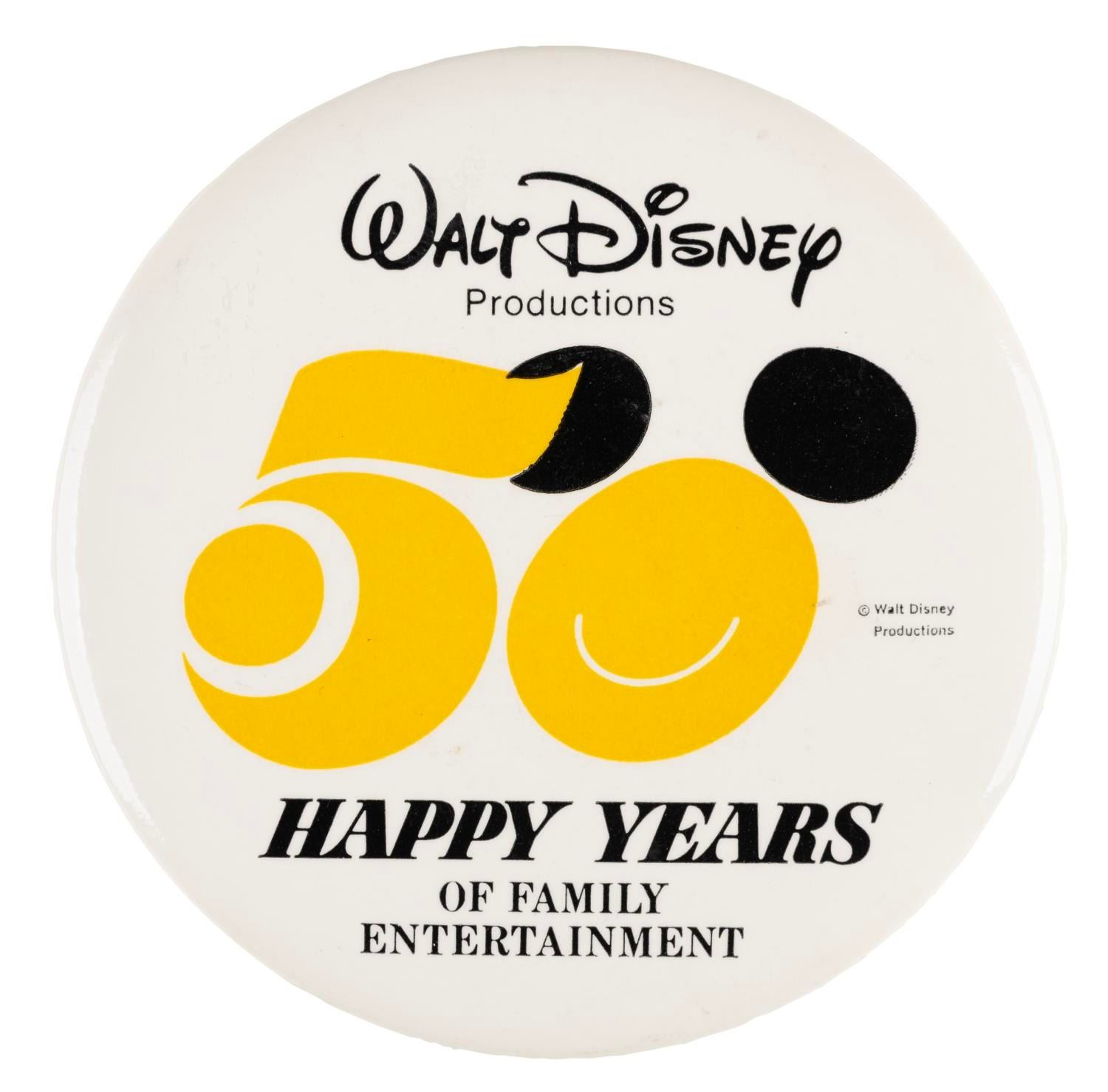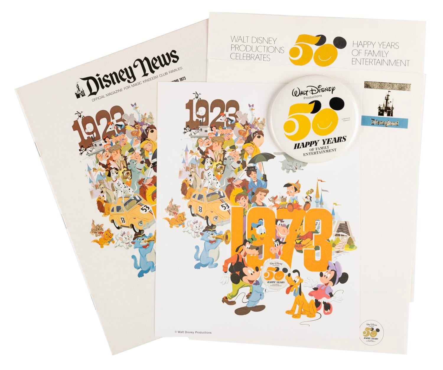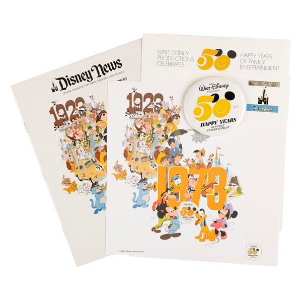 (Disney, 1973) A collection of Walt Disney Productions "50 Happy Years" letterhead and ephemera. This collection includes a pair of Disney Studios and Disneyland commemorative letterhead, Cast Member exclusive Disney News magazine and lithograph, and a 50th anniversary pinback button. The paper ephemera measures between 8.5"x11" and 8"x10", while the button measures 3.5" in diameter. The collection is in fine condition with light handling and surface wear to the Disney News magazine, and minor oxidation visible on the reverse of the button.
