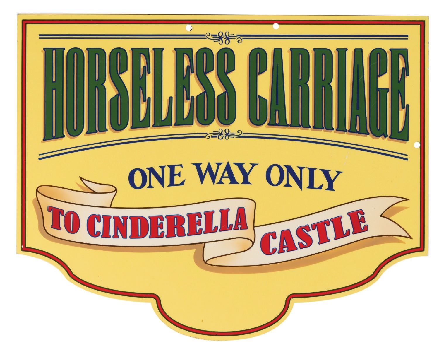 (Walt Disney World, 2000s) A hanging sign for the one-way route of the Horseless Carriage to Cinderella Castle at The Magic Kingdom. Signs of this style were created for display near the Town Square stop on Main Street U.S.A. Measuring 15"x19", the metallic sign is in very good condition, with minor scuffs and scratches from Park display.