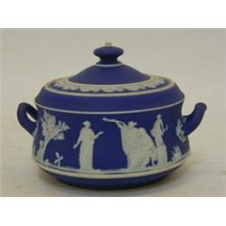 A WEDGWOOD DARK BLUE JASPER DIP COVERED BOWL, twin handled, classical subjects, height 12cm 30-40