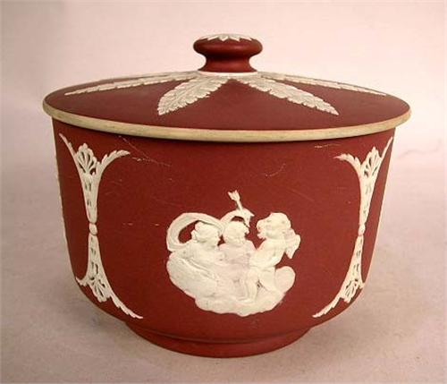 A WEDGWOOD, ENGLAND MAROON JASPERWARE COVERED BOWL; With leaf-motif lid, and Neo-classical scene in white relief, 5 5/8"dia, some discoloration to interior